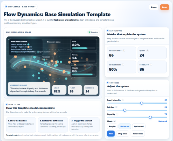 This is the reusable Simfluence base widget. It is designed as a flexible template for many different simulation fields: operations, sales funnels, customer flows, logistics, service systems, workforce allocation, process bottlenecks, and other causal systems. The structure stays stable while the labels, metrics, controls, and logic can be tuned to fit each use case.