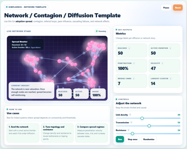 Use this base for linked systems where spread depends on connectivity and thresholds. It fits adoption spread, contagion, referral loops, peer influence, cascading failures, information diffusion, trust propagation, and other network effects where local connections shape global outcomes. The template is built to make saturation, resistance, clustering, and tipping points easy to see.